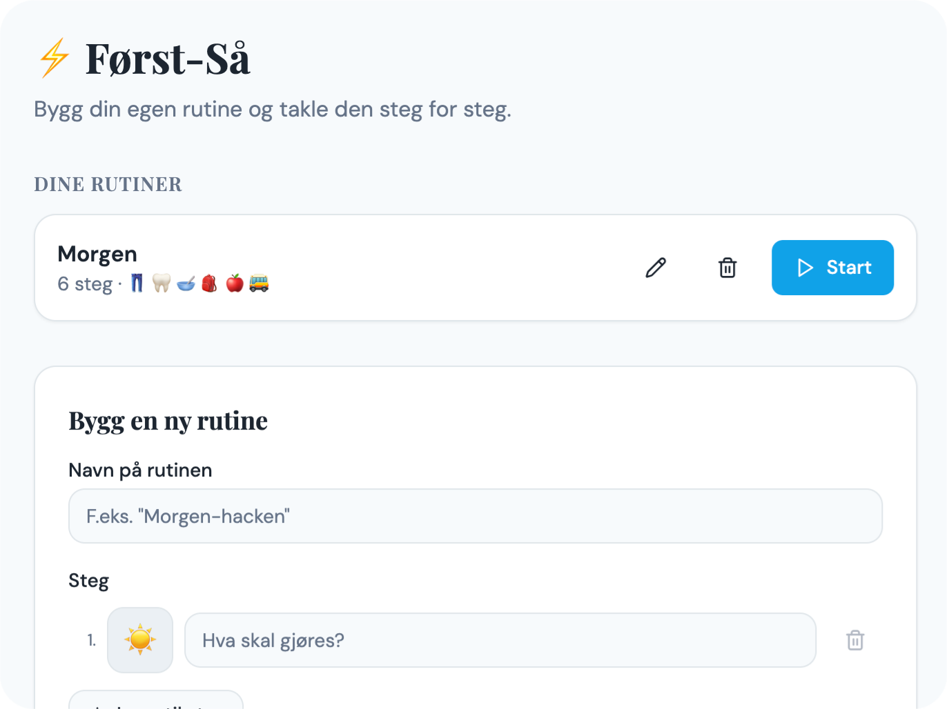 🪜 Hjelp til å komme i gang (støtte for eksekutive funskjoner): for barn som går i "frys" og sliter med å starte på oppgaver. Vi bruker tydelige rutiner ("Først-Så") og forbereder alle overganger, slik at barnet opplever mestring i stedet for kaos.