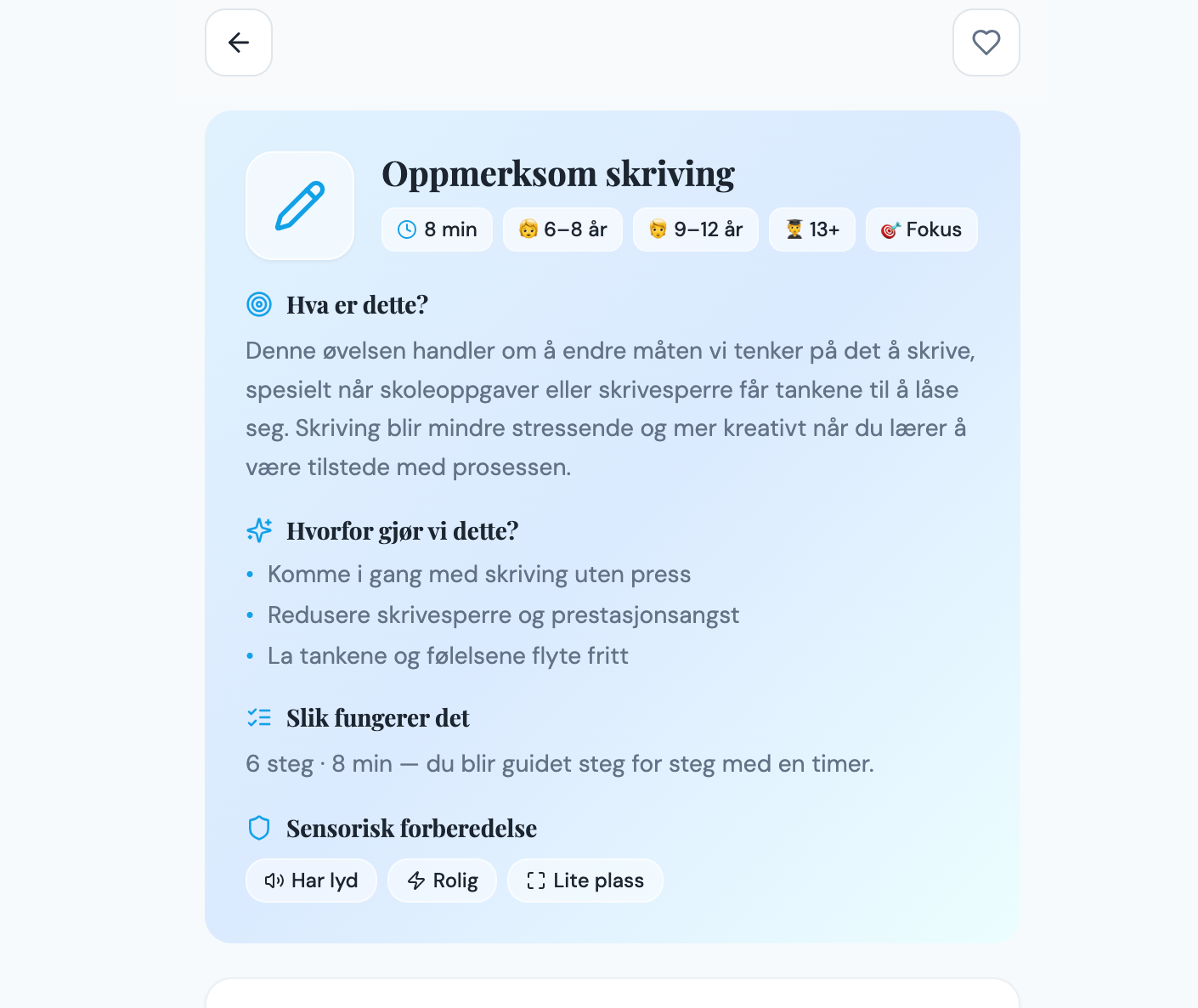 Tradisjonelle "finn roen"-apper er bygget for nevrotypiske hjerner. For våre barn føles det som et overgrep av stillhet og umulige krav. Forskning viser at når vi tvinger nevrodivergente barn inn i disse boksene, ber vi dem egentlig om å maskere. Resultatet? De kjenner på skam, kravunnvikelse (PDA) og følelsen av å mislykkes – igjen. Og du sitter igjen som en utmattet forelder etter enda en leksekamp som endte i tårer.