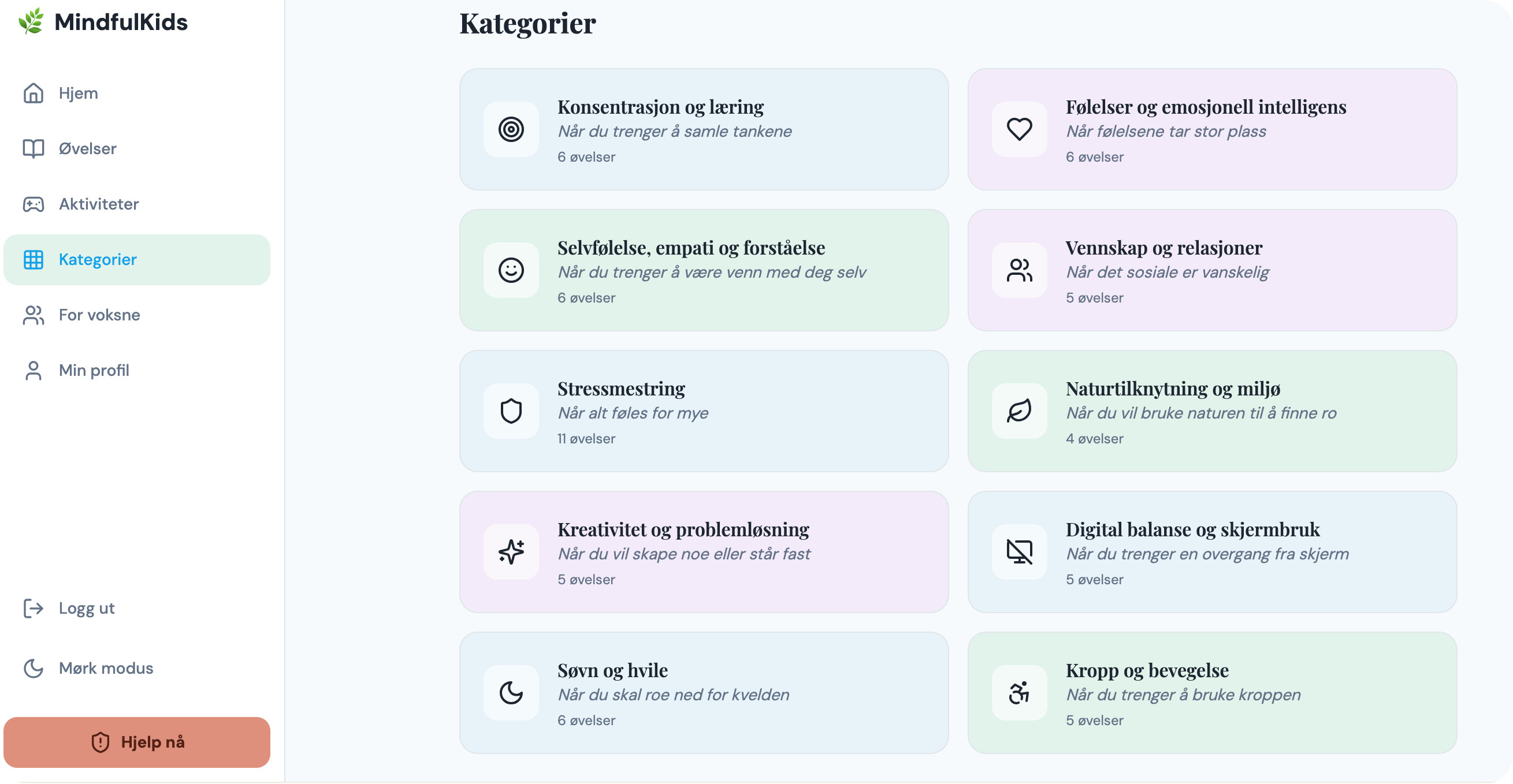Inne i appen finner barnet et stort, men oversiktlig bibliotek. Vi har delt verktøyene inn i 10 kategorier basert på hverdagens faktiske behov: