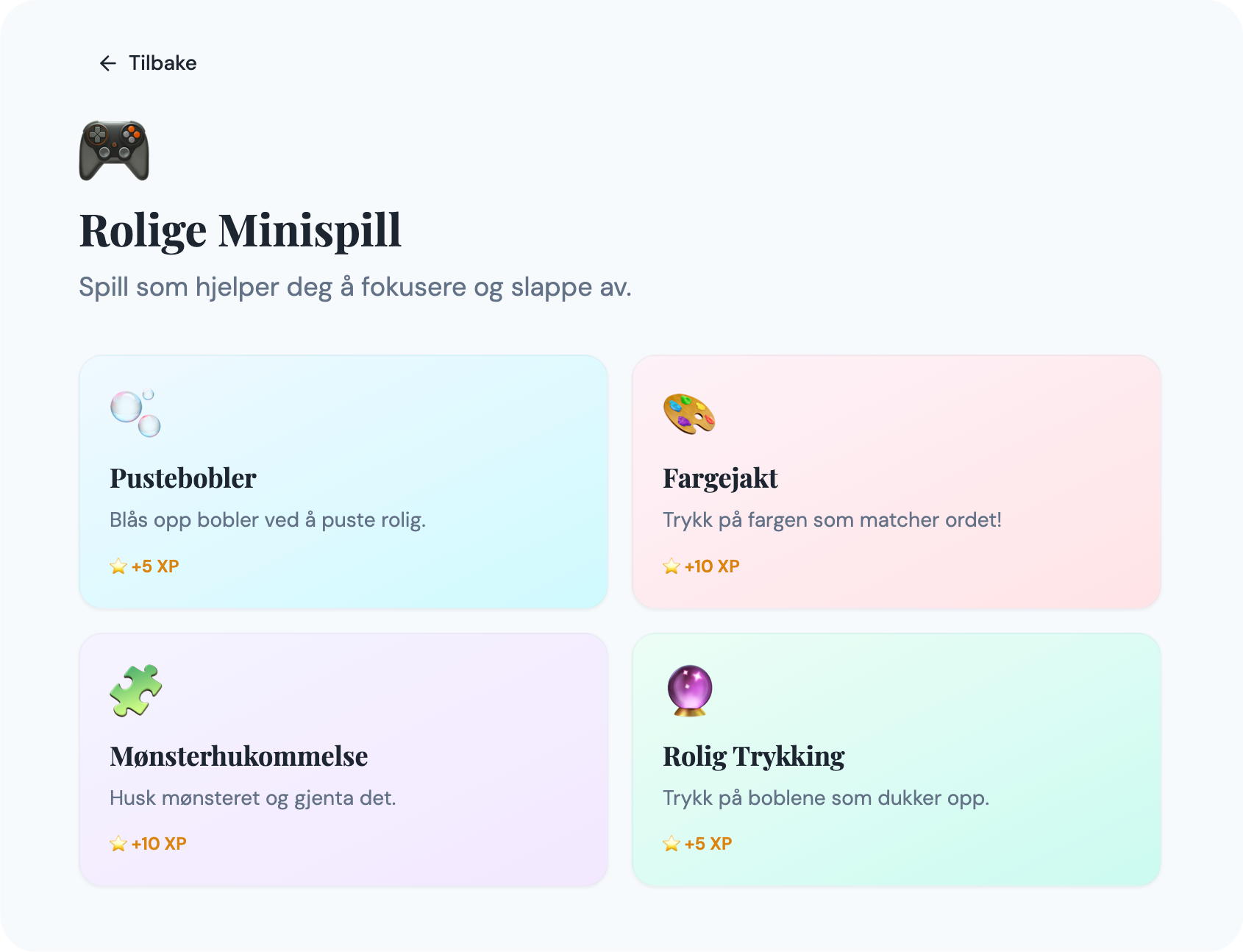 Mange barn bærer på bagasje etter å ha blitt misforstått i årevis. Derfor har appen vår null krav om øyekontakt, null krav om å sitte stille, og null forventninger om "passende" respons. Barnet får lov til å være nøyaktig den de er, helt uten å måtte maskere.