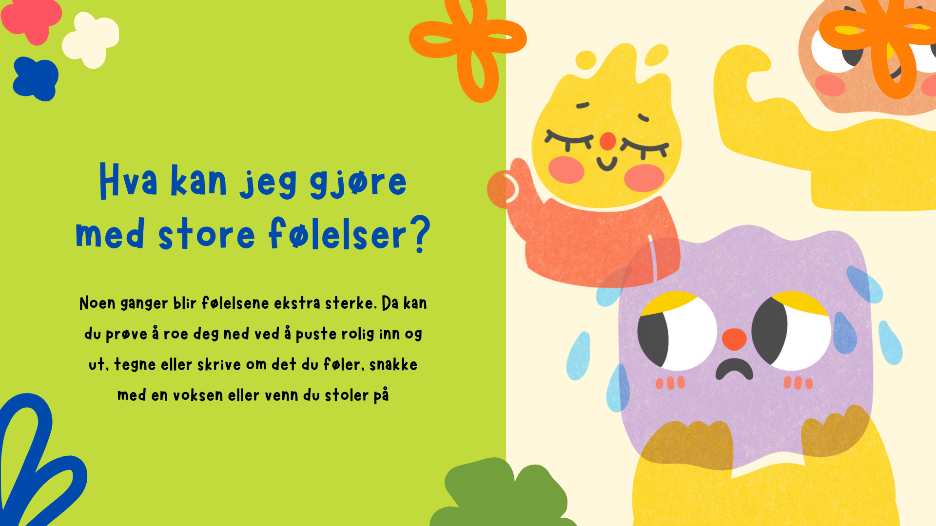 Bruk bokens eksempler, bilder og forslag til hva dere kan gjøre med store følelser – som å puste rolig, tegne, eller snakke sammen – for å hjelpe barnet å finne strategier som fungerer for dem .